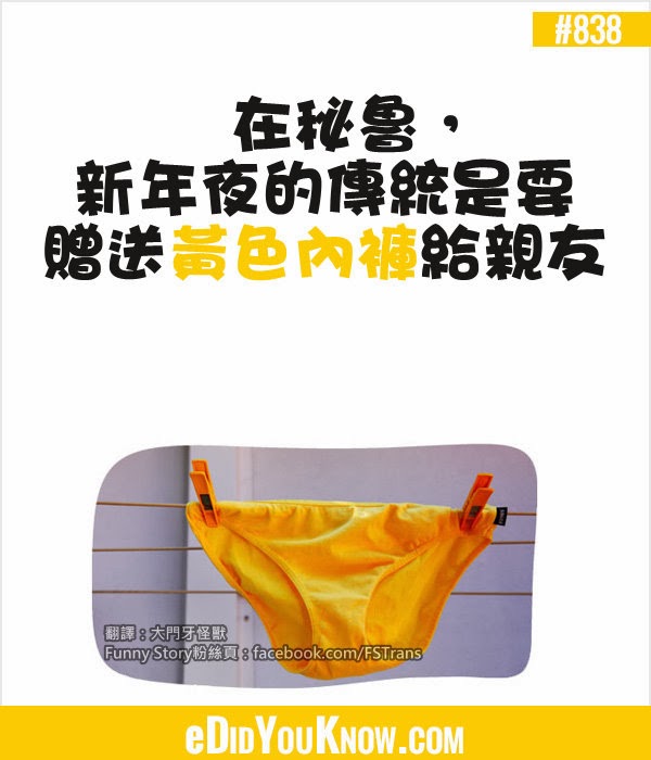 對秘魯人來說,黃色是會帶來好運的顏色(就如同我們認為紅色代表喜氣一樣)。因此到了過年時,攤販就會販售大量以黃色為主色的商品,其中也包含了內褲。對秘魯人來說,穿著黃色內褲可以帶來好運,因此也適合拿來做為贈禮,才會有這樣的習俗產生。