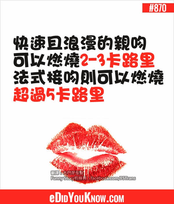 一個快速浪漫的接吻可能要燃燒2到3卡路里的熱量,而法國式接吻卻至少要燃燒5卡路里,因為法國人接吻需要張開嘴,舌頭進行接觸。科學家宣布,要想達到減肥的效果,我們並不需要瘋狂接吻。每天只需三個持續20秒的吻,就能讓你達到減輕體重的目的。