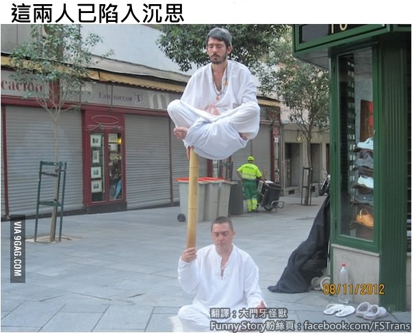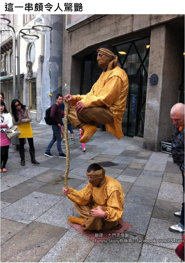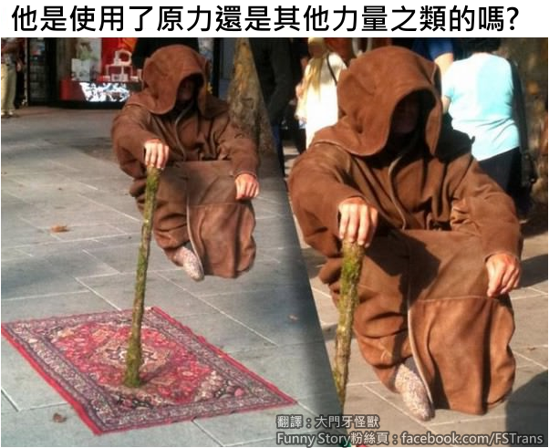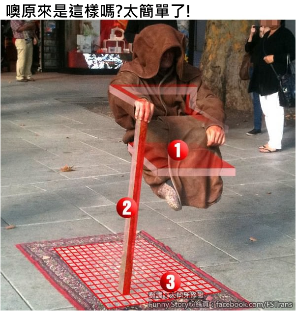 大家應該會發現,通常這些飄浮的人手中都會握有一根棍子,彷彿自己只要單手撐著棍子就能憑空浮起似的。