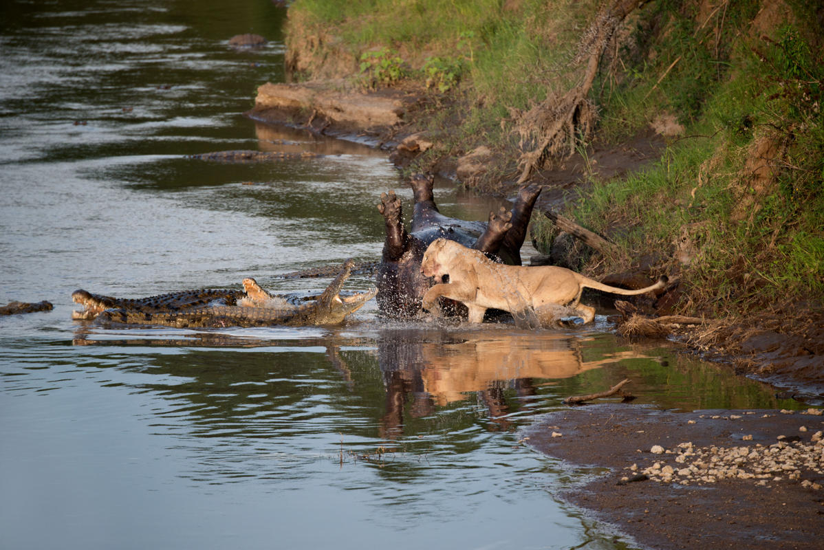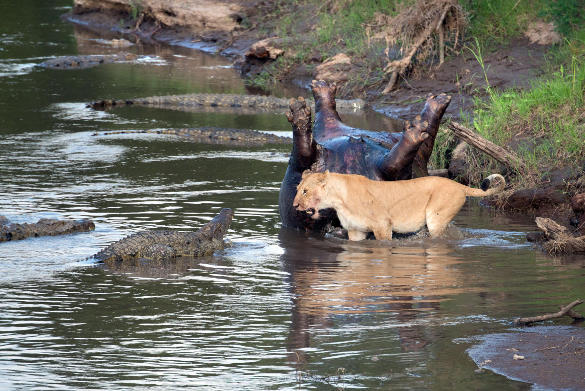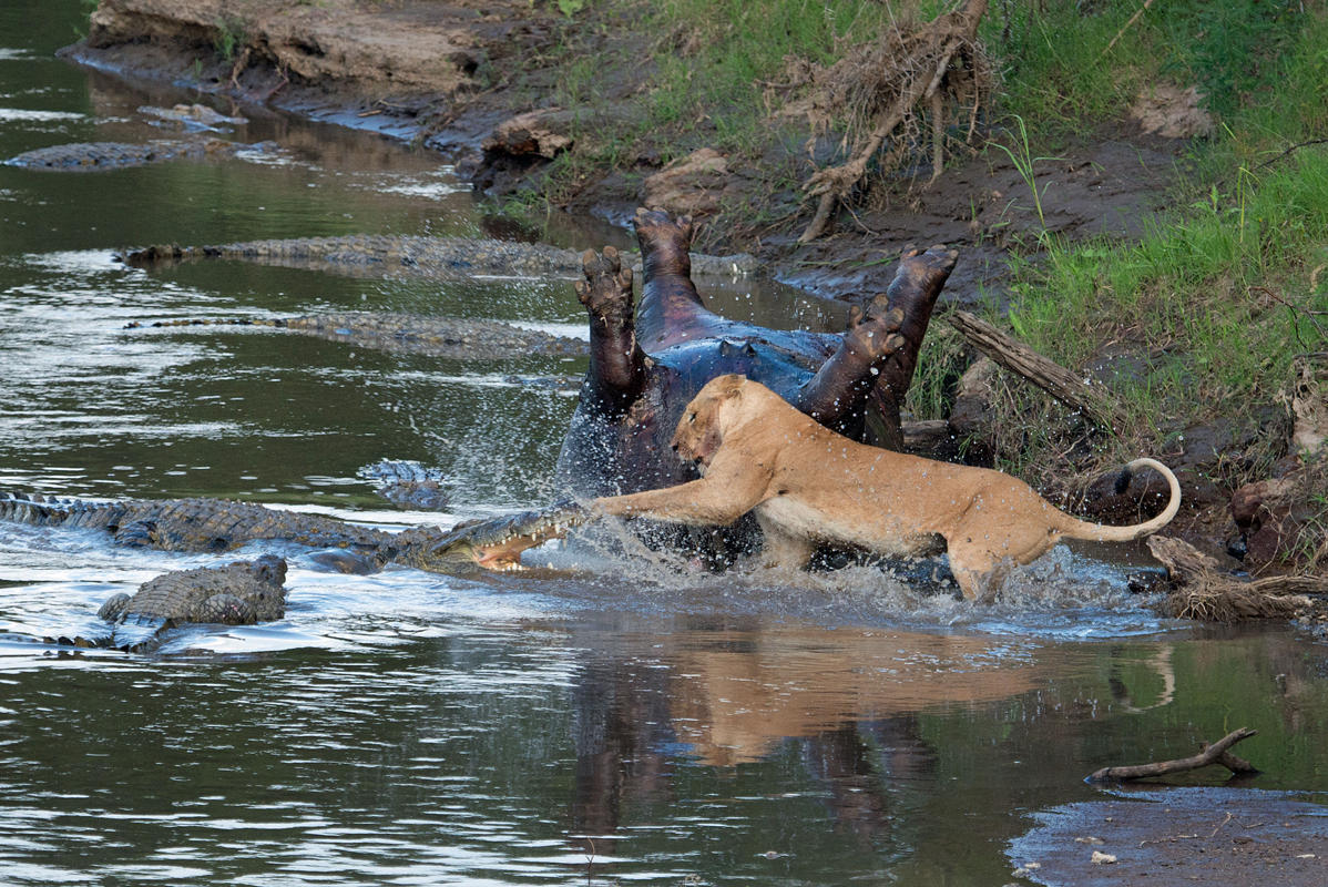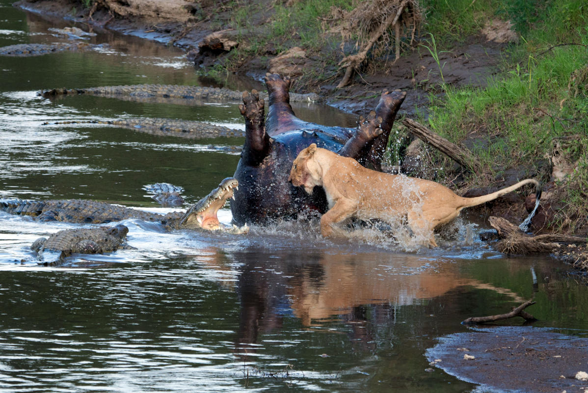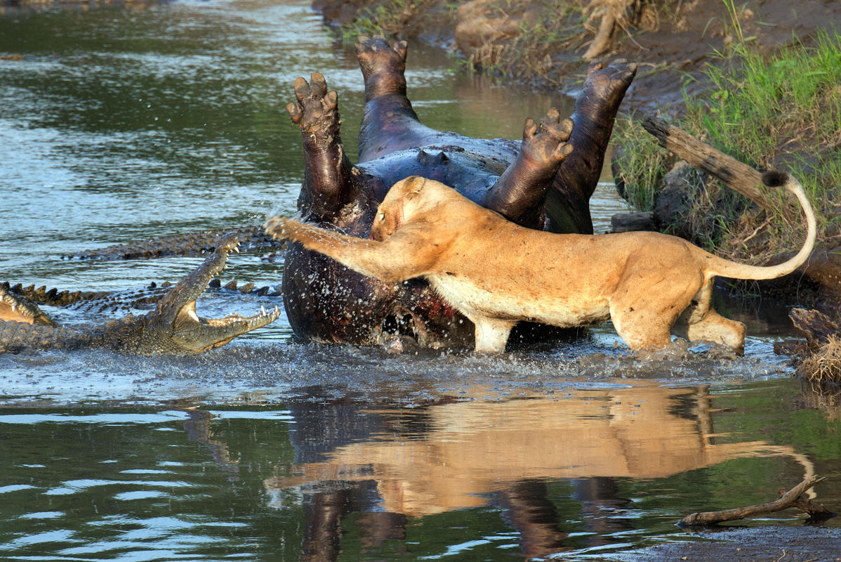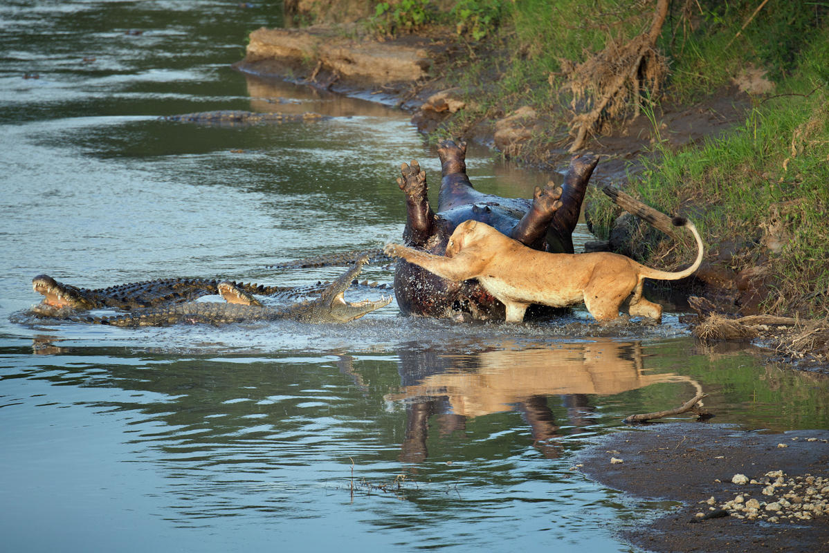 業餘攝影師Richard Chew與妻子在肯亞旅行時,發現一頭饑餓的母獅與一群鱷魚爭奪食物。倒在河邊的河馬看似是自然死亡,結果卻引發了自然界的戰爭。Richard Chew用相機拍下這些珍貴的鏡頭。