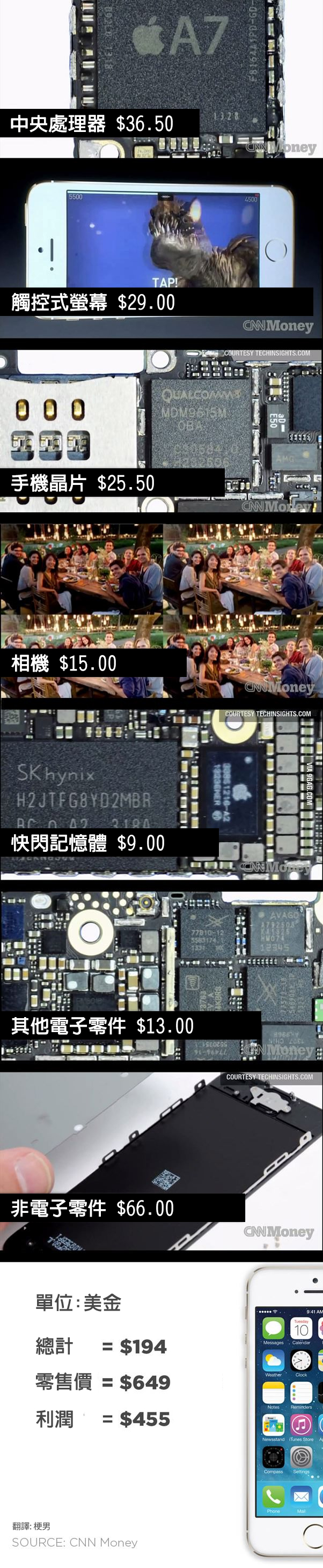 揭露iPhone 5S的成本造價,來看CNN怎麼說 梗男Apple, CNN, iPhone2014/09/045023 蘋果族就是潮XD!其實大家都知道,現在我們拿這些名牌產品,舉凡是3C用品、衣物、包包、鞋子,其實貴的都是那個品牌,其背後的造價都是低廉的,名牌商品大多數都是暴利產品。但因為有設計感、材質好,有些人也是看上功能性,所以品牌風潮才會一發不可收拾。 以下是CNN報導的每支iPhone5S的基本造價,我們來看一下。 單位:美金 當然以上是指iPhone5S的基本材料成本,未包含廣告行銷費用、員工職員和血汗工廠的勞工成本。 來看一下CNN的影片吧! 分享到Facebook