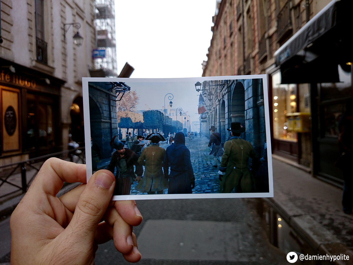 一位名叫Damien Hypolite的玩家,將遊戲畫面列印下來,拿著照片到巴黎的景點一一比對,發現真的可以巧妙地結合實地背景。