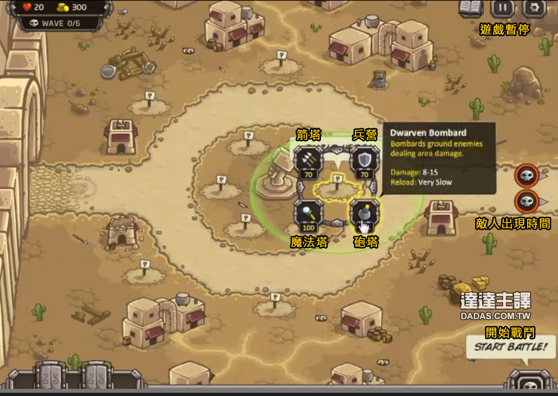 兵營:生產步兵擋住敵人去。砲塔:對地區域性攻擊(無法攻擊飛行敵人)。箭塔:對地對空攻擊。魔法塔:對地對空攻擊,可用來攻擊防禦力高的敵人。