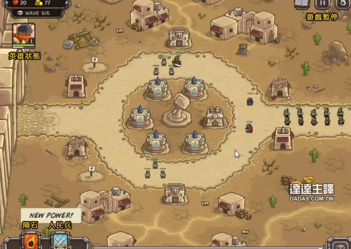 遊戲中期會出現英雄,可將他擺在重要位置。如果不幸敵人突破防線,你可召喚出隕石瞬殺敵人,或是召募人民兵一起出來助陣。