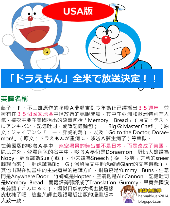 你知道嗎?哆啦A夢動畫版今年夏天要在美國首播了!可是它似乎不是我們所熟悉的哆啦A夢,筷子變成叉子、日鈔變成美元・・・・・・還有哪裡不一樣?修改的原因又是什麼?讓小記者漢娜為你詳盡報導!