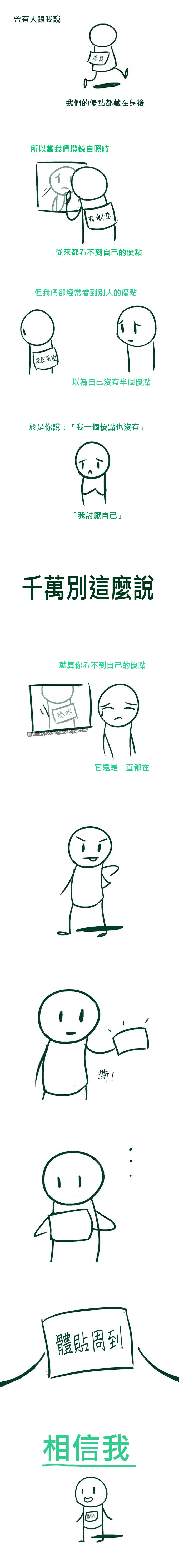【勵志譯圖】每個人的優點都藏在身後 Inga W.人生, 優點, 勵志, 勵志譯圖2014/09/148549 你覺得自已一無是處嗎?跟那些優秀的人比起來,自己就像個微不足道的路人甲?如果你是這樣看待自己的,請一定要看看這篇漫畫。 圖片來源:http://jpegy.com/comics/good-traits-are-on-our-backs-17934 延伸閱讀──[哲思漫筆] 你覺得自己低人一等嗎? 喜歡我的翻譯,請按讚或留言讓我知道喔! 分享到Facebook