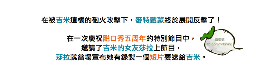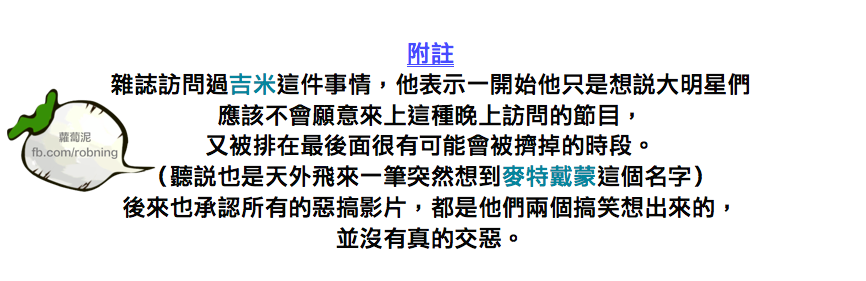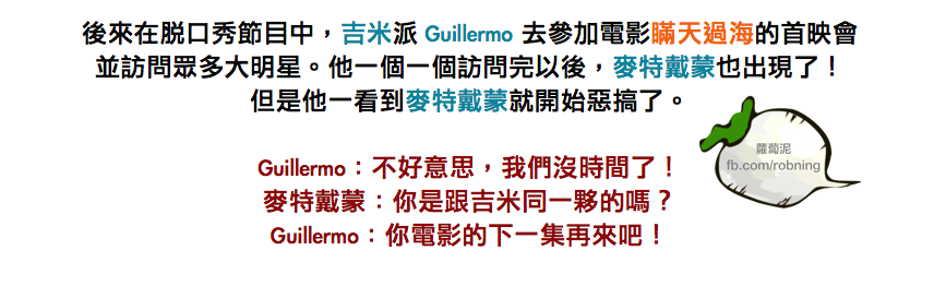 麥特戴蒙與吉米基莫的經典戰爭 蘿蔔泥Jimmy Kimmel, 吉米基莫, 班艾佛列克, 麥特戴蒙2014/06/08101171 最後最後,感謝達達主譯的譯者們卡勒、大門牙與阿亮、Tony協助校稿,謝謝! 分享到Facebook