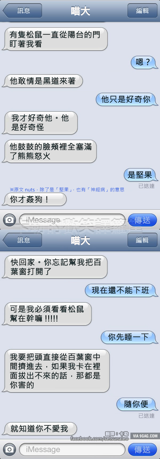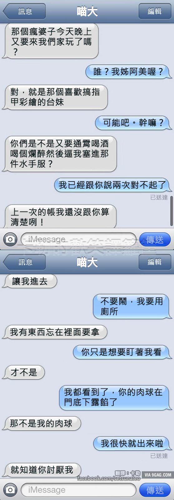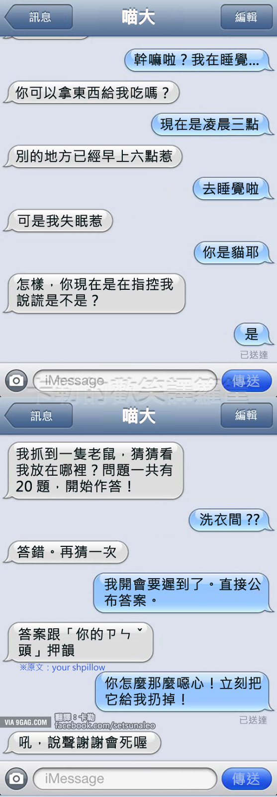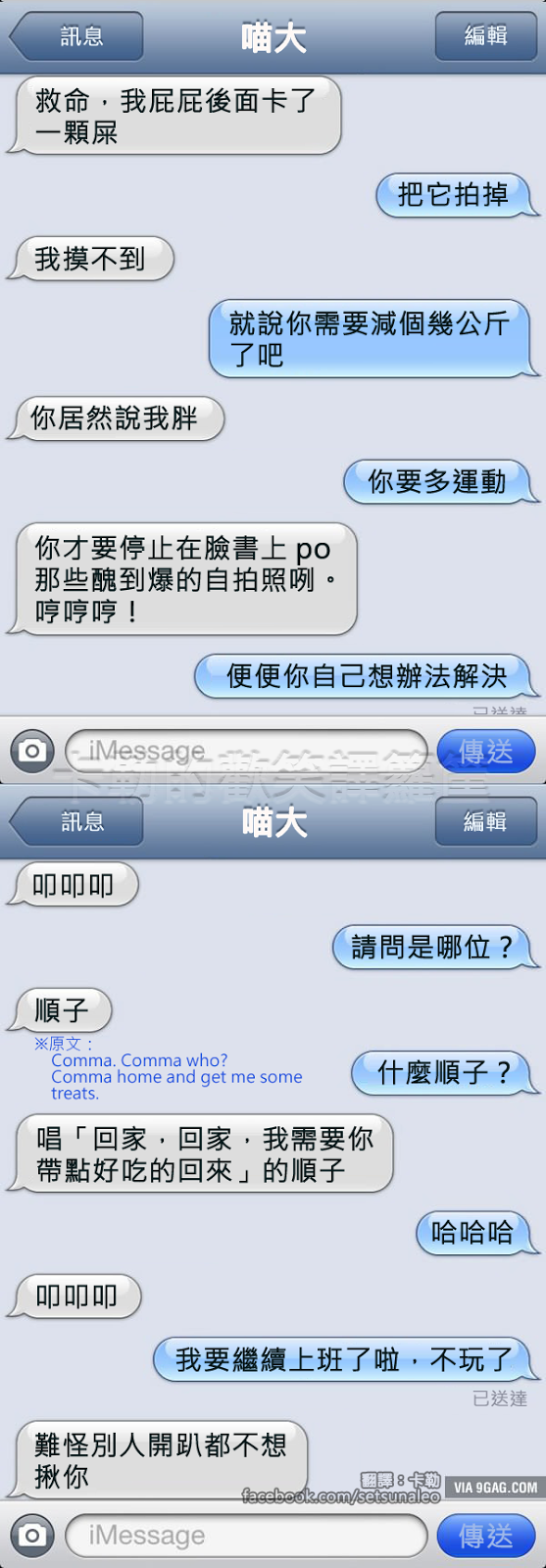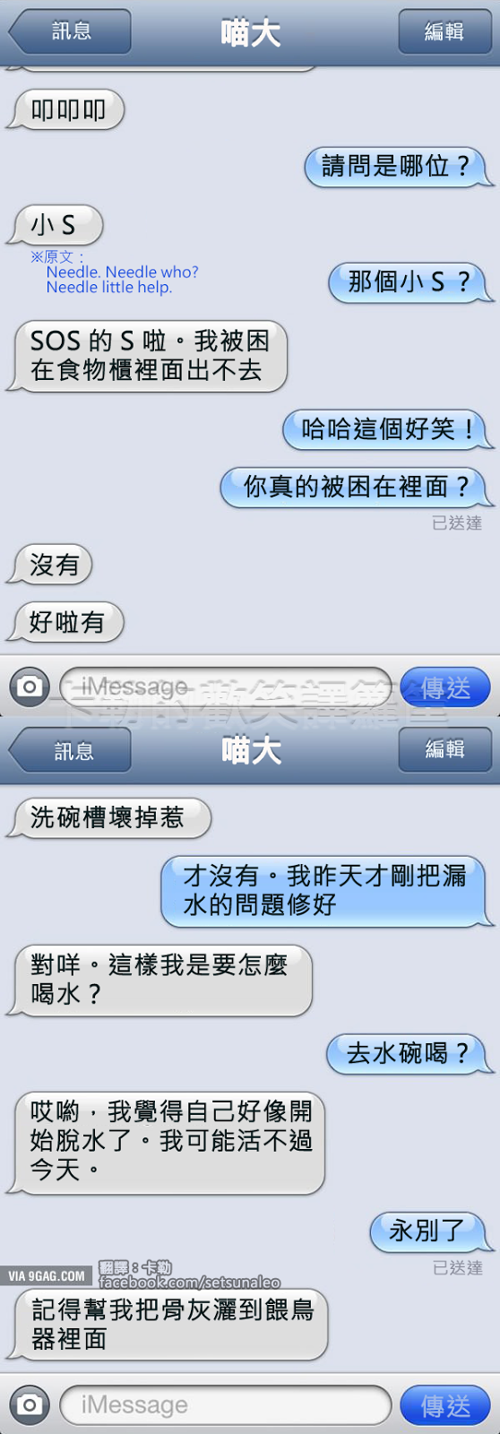與喵大的簡訊時光 卡勒2014/02/061 如果你家喵星人也持有一台哀鳳,跟你在訊息中一來一往,會是怎樣的情景?一起來看這個超具創意的簡訊內容吧! (補充說明,圖文中的主人是女的,原本以為沒什麼差,後來發覺有一些小影響XD) 本圖之修圖特別感謝Funny Story的阿亮、麗莎邱的指導,不然我會土法煉鋼到下個月也翻不完orz ※原文Hooters貓頭鷹餐廳,以穿著火辣的女服務生聞名。 圖片來源:Text Messages From A Cat 來源網站:9Gag — 分享到Facebook