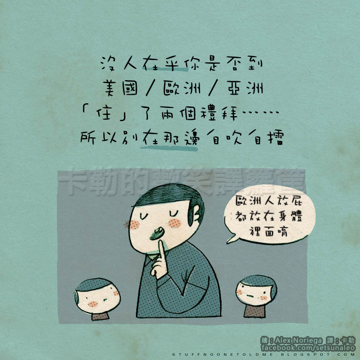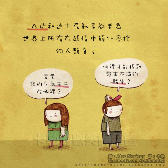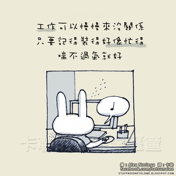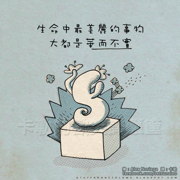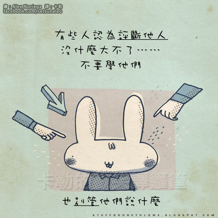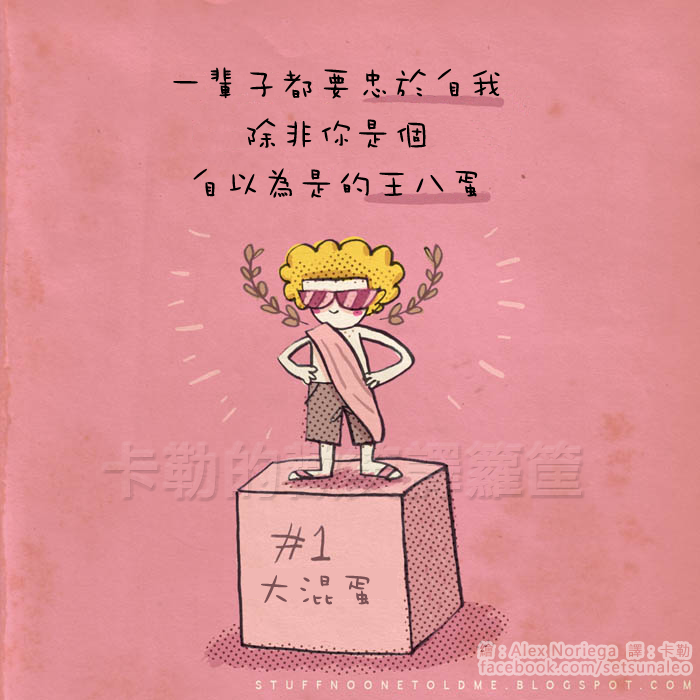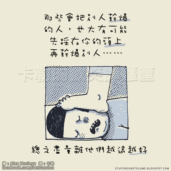 Alex Noriega是一名來自巴塞隆納的插畫家,現年三十多歲,輾轉在荷蘭、巴塞隆納、台灣、美國、馬布多間生活,曾做過管理員、服飾製作,最後又回歸本業畫插畫。目前人在巴西。2010年,Alex陷入焦慮危機,他不知道自己在做什麼,工作又不順遂,人生喪失目標。因此他創立了「Stuff No-One Told Me」部落格,開始將他一生所學、所碰到的事物畫下來,想釐清自己的思緒,了解自己做錯了什麼,了解週遭事物運行的道理。最後他發現,這個世界,其實沒什麼道理。 他一共畫下81張圖,我將分做十篇,一一分享給大家欣賞:)