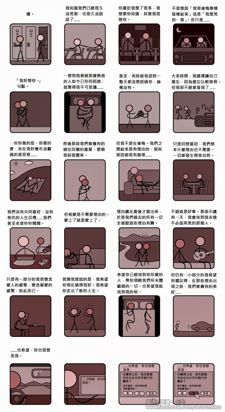 我最親愛的曾經,其實我想對你說 卡勒2013/10/077862 感情不是件容易的事。 兩人相愛,自是有緣;若分手了,也不必反目成仇。回首往昔,那些回憶終究是無可抹滅的甜蜜戀曲。所以放下吧,並心存感謝,感謝那個人曾帶給你無限美好。 可搭配張惠妹〈我最親愛的〉一曲服用。 圖片來源:http://imgur.com/TAwm5MW 分享到Facebook
