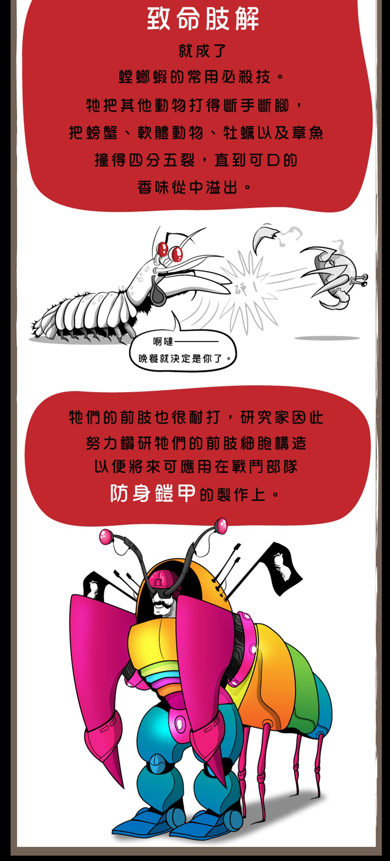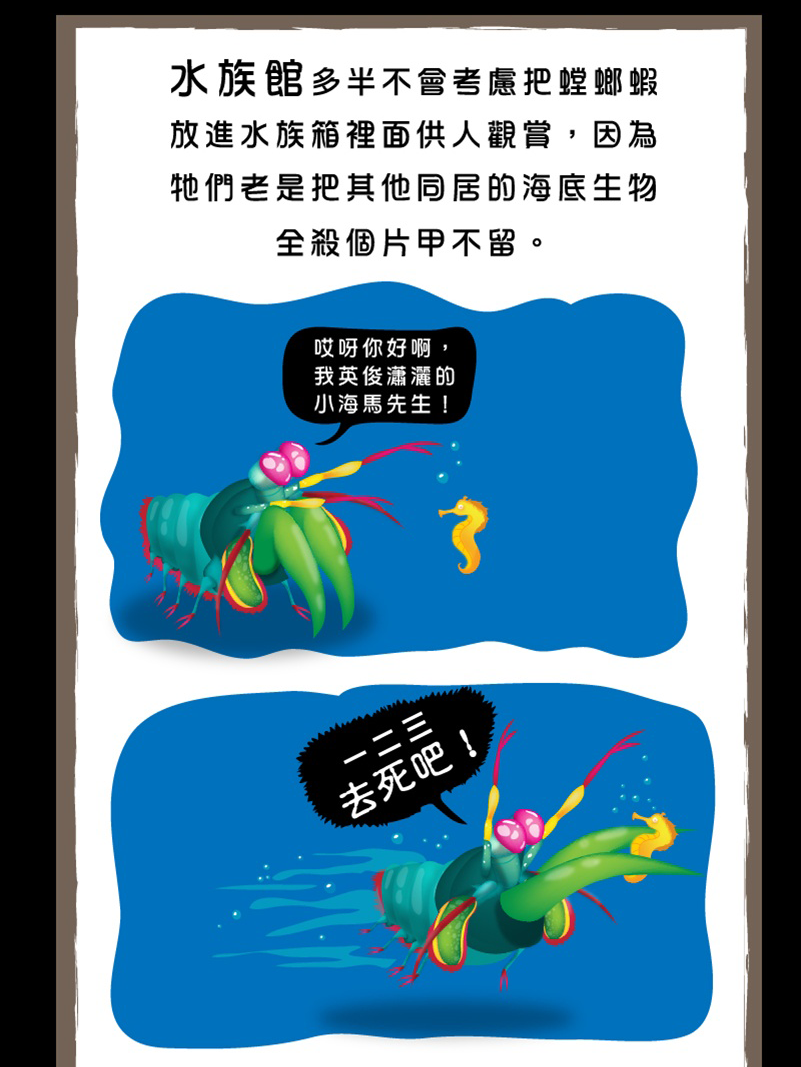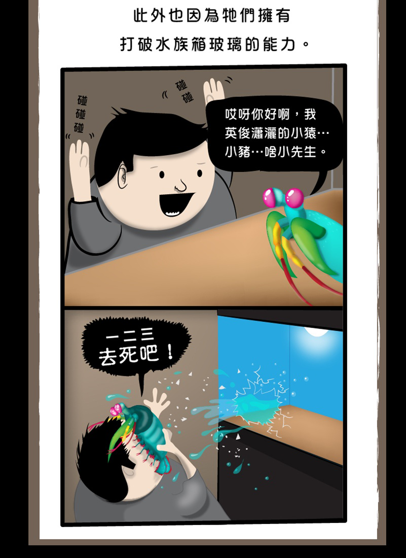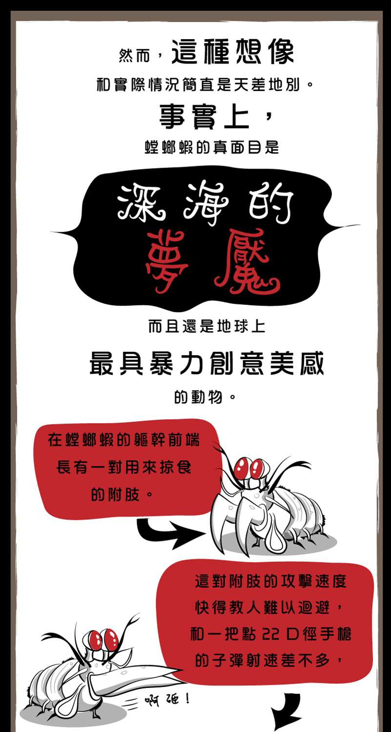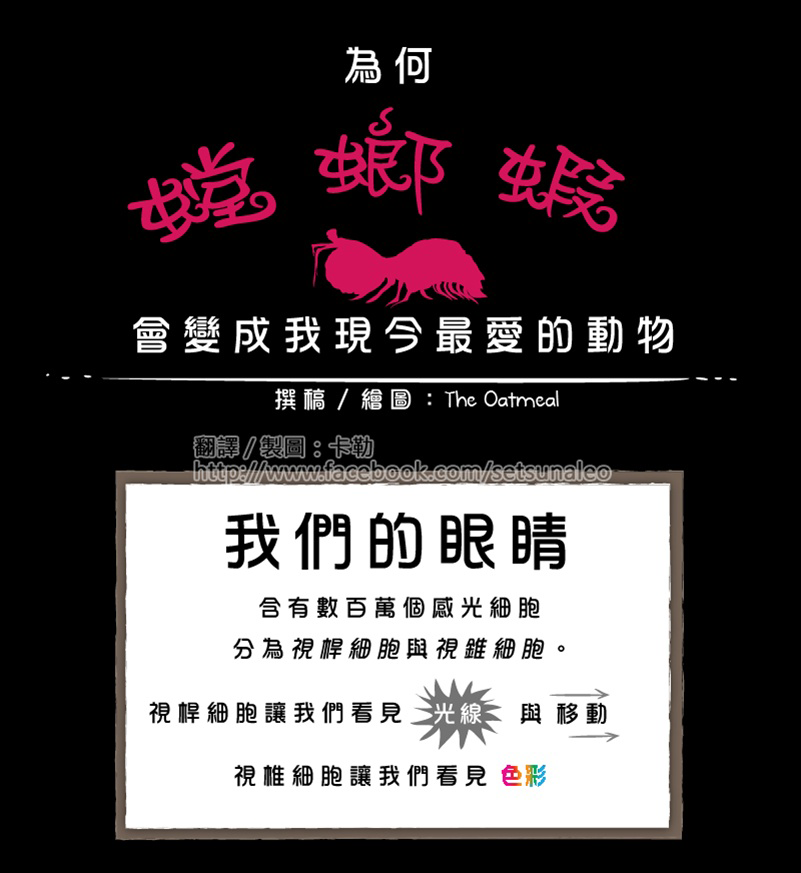 Oatmeal畫知識:為何螳螂蝦會變成我現今最愛的動物 卡勒Oatmeal畫知識, 動物2013/09/052883 本篇請搭配〈你有所不知的螳螂蝦〉一起服用,讓你更加認識這個深海的小惡魔! 繪圖:Oatmeal 圖片來源:Why the mantis shrimp is my new favorite animal — 分享到Facebook