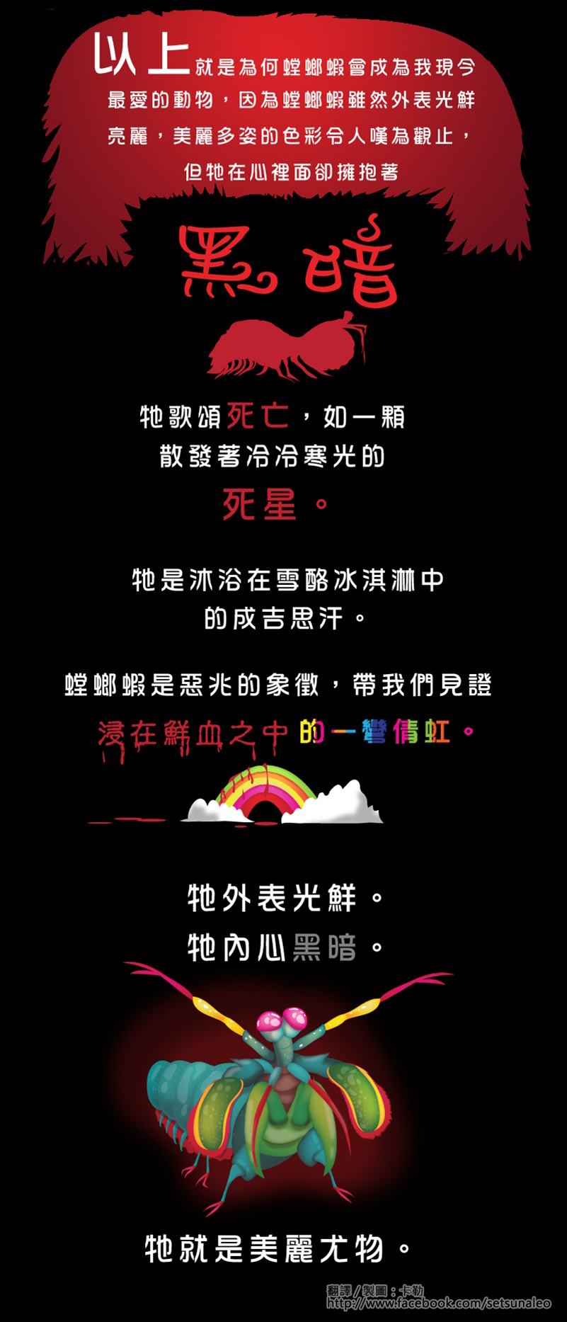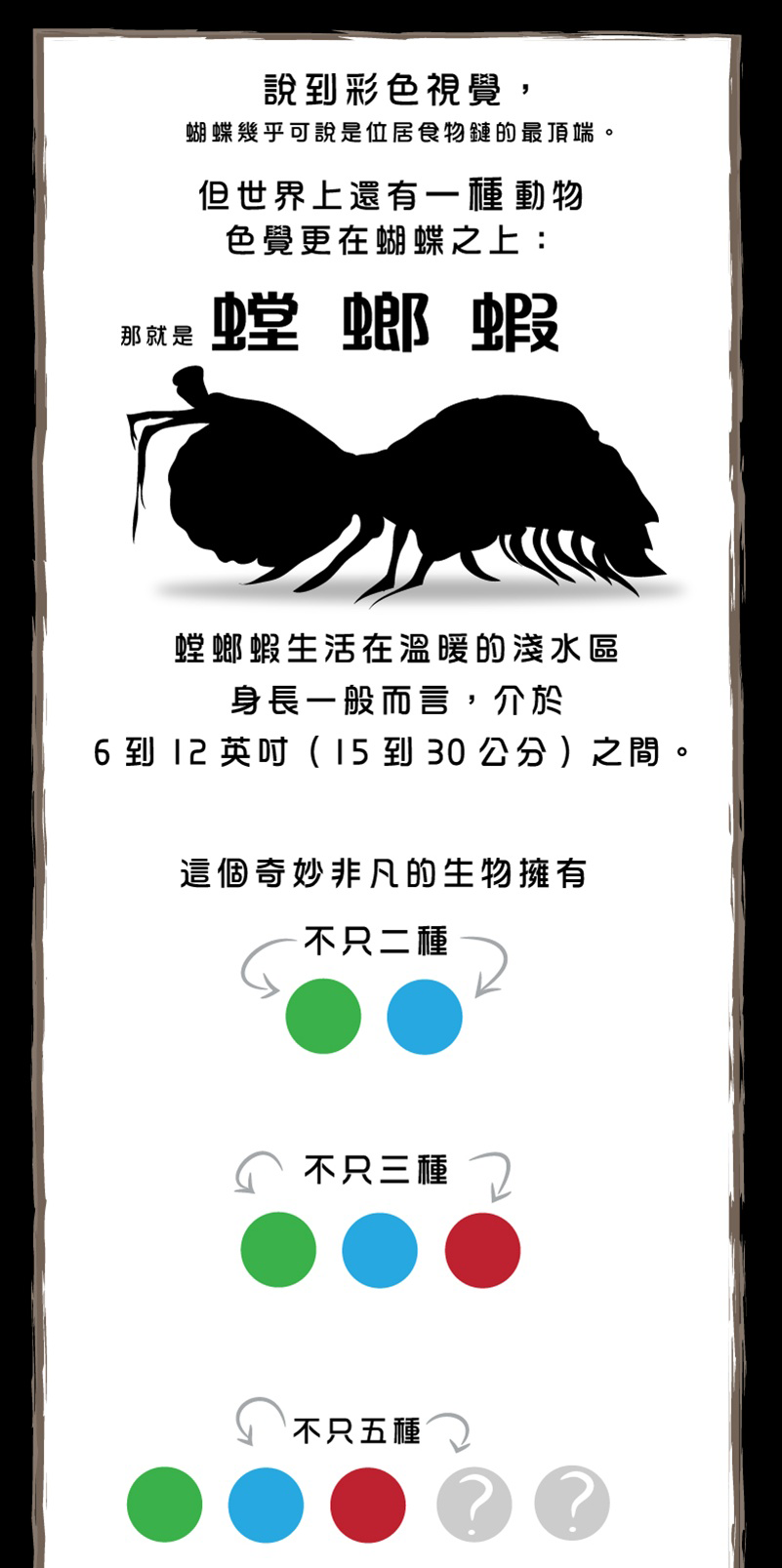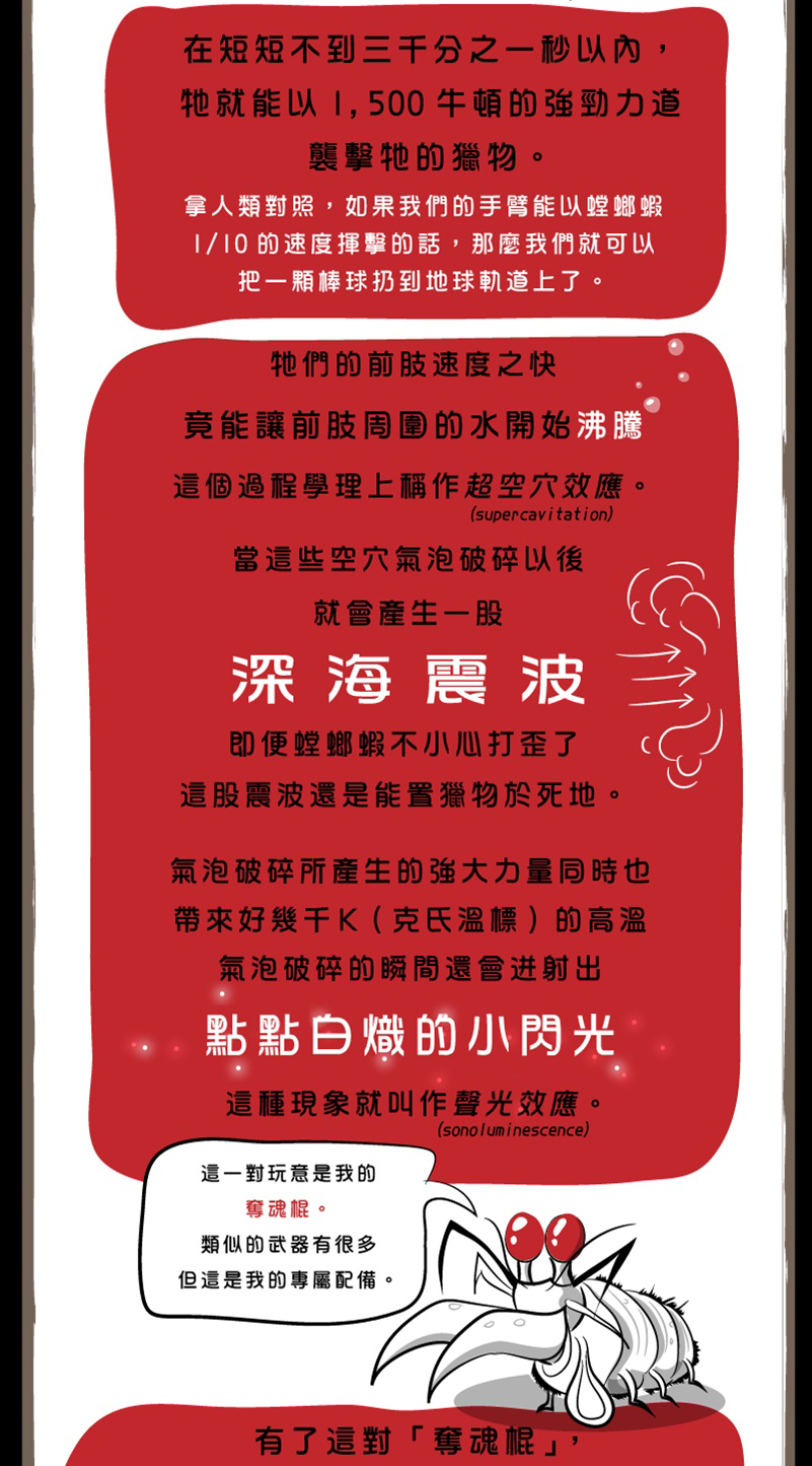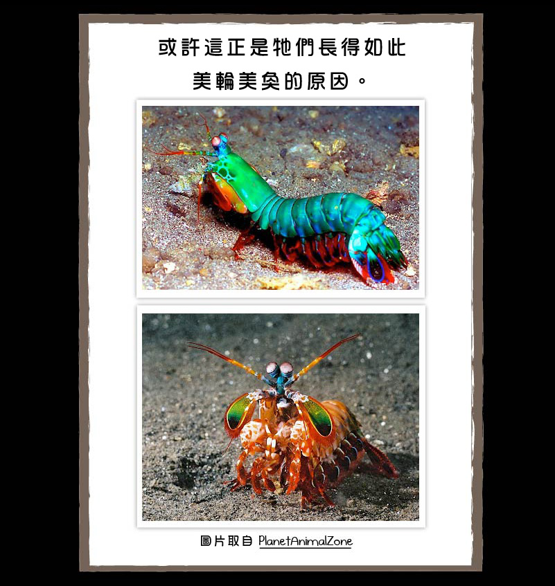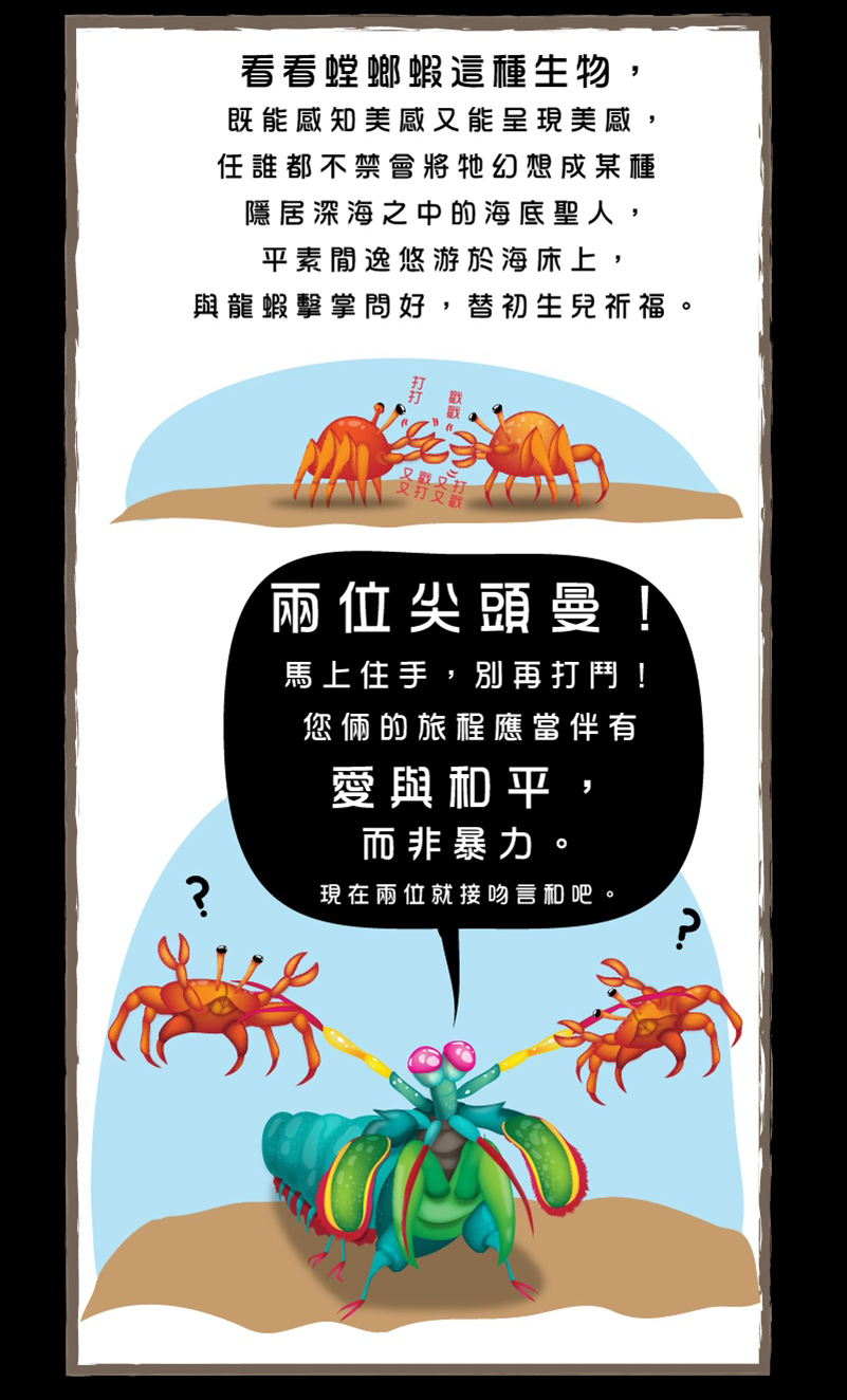 Oatmeal畫知識:為何螳螂蝦會變成我現今最愛的動物 卡勒Oatmeal畫知識, 動物2013/09/052883 本篇請搭配〈你有所不知的螳螂蝦〉一起服用,讓你更加認識這個深海的小惡魔! 繪圖:Oatmeal 圖片來源:Why the mantis shrimp is my new favorite animal — 分享到Facebook