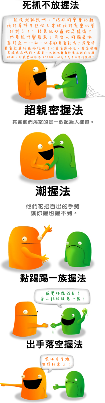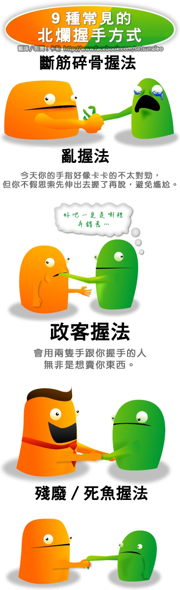 Oatmeal畫知識:9種常見的北爛握手方式 卡勒Oatmeal畫知識2013/08/272709 和人初次見面的時候,握手是免不了的禮俗。不過每個人的性格千奇百怪,有時會不知道該如何……跟他們握手才好。 所以人有哪些握手方式呢?請看Oatmeal的圖解! 但Oatmeal不曉得的是,台灣有一種最致命的握法: 繪圖:Oatmeal 圖片來源:The 9 Types of Crappy Handshakes — 分享到Facebook
