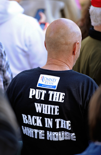 在2012年十月12日羅姆尼造勢大會上,有位支持者身穿一件T恤,上頭印有歧視意味濃厚的字眼:「讓白宮再次變白吧。(Put the white back in the White House.)