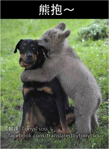 狗狗表情好無奈 XD 而且小熊還偷咬狗狗耳朵!