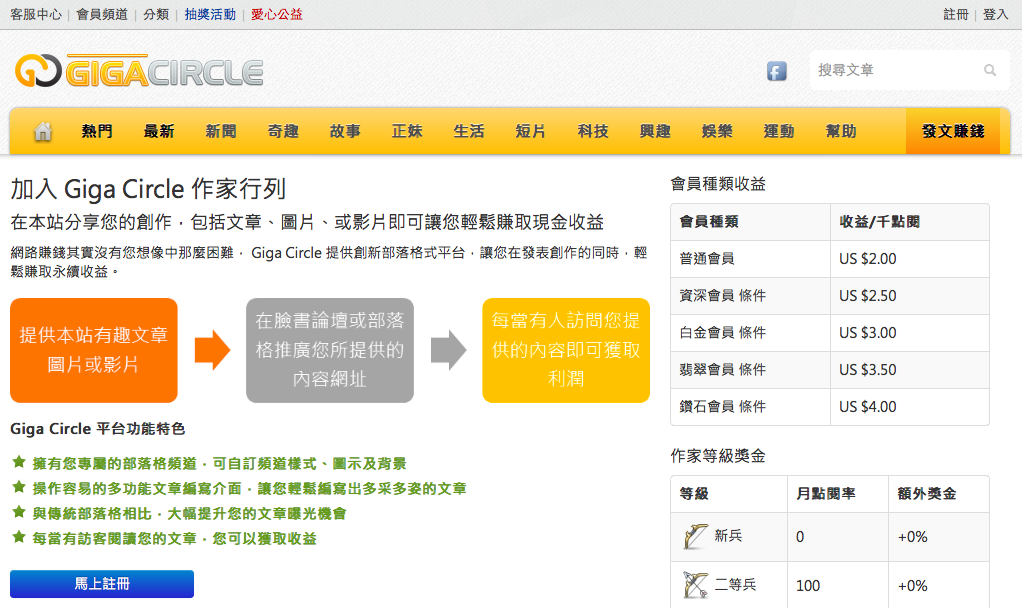 Giga Circle 會利用文章發表以及點閱給予您獎賞,您同意所有獎賞規定以及計算方式將由 Giga Circle 自由制定,Giga Circle 並沒有任何支付您獎金的法律義務或責任。您同意 Giga Circle 有權利對點閱數據進行修改或過濾而不需任何原因理由。您同意 Giga Circle 有權利修改、新增、移除任何獎金制度,無論任何原因理由並且不必做任何預先通知。您若違反任何條款或規定,或者Giga Circle認為有必要性無論任何原因理由,Giga Circle有權利修改、新增、移除您帳戶內的點閱率或獎金。您同意您不會用任何不正當手法增加您發表的文章或他人發表之文章點閱率。